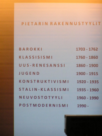 Ohessa on kuva hänen tekemästään Pietarin rakennustyylien ryhmittelystä. Väkeä oli tällä kertaa paikalla Maailman kulttuurien laitoksella liki kolmekymmentä henkeä.